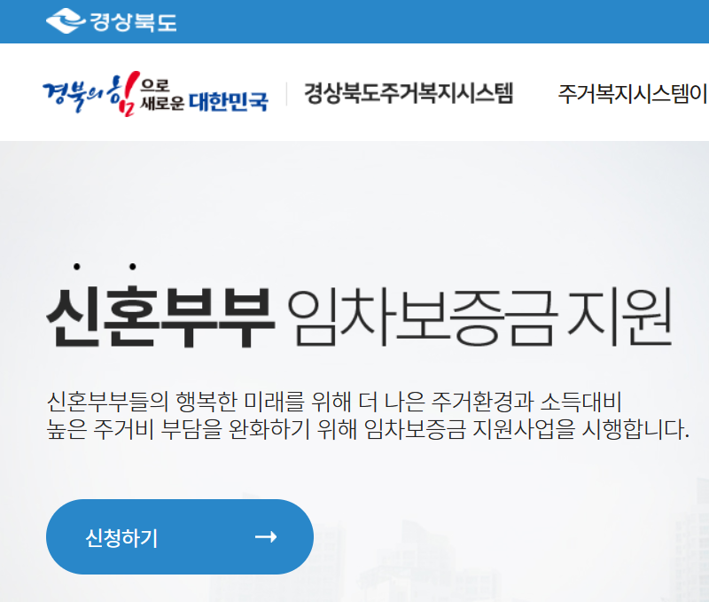 경상북도에 주민등록이 되어있거나 임차보증금을 지원받은 후 1개월 이내에 경상북도로 전입예정인 신혼부부 또는 혼인신고기준으로 7년 이내의 부부에게 임차보증금 이자지원을 합니다.