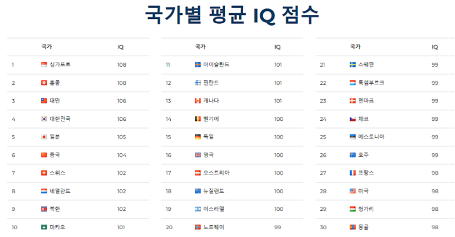 한국인의 평균 아이큐는 대략 100 정도입니다. 전 세계적으로는 평균적으로 100으로 설정되어 있지만