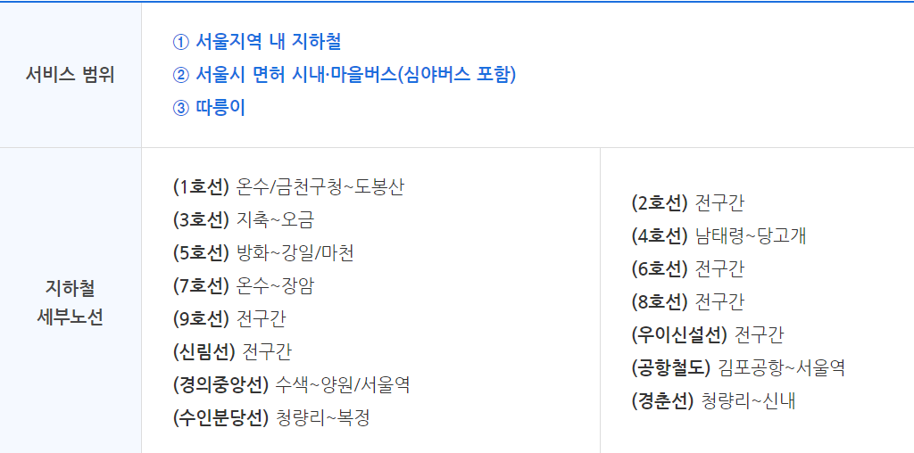 -1회만 충전하면 30일 동안 서울 시내의 대중교통(버스와 지하철),그리고 따릉이를 제한 없이 탈 수 있습니다.