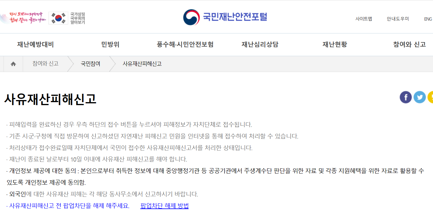 기존에는 자연재해 피해신청을 시. 군. 구청에 직접 방문하여 신고하였지만