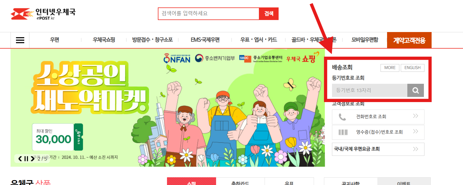 - '등기번호(13자리) 조회' 란에 배송받은 등기번호를 입력합니다.