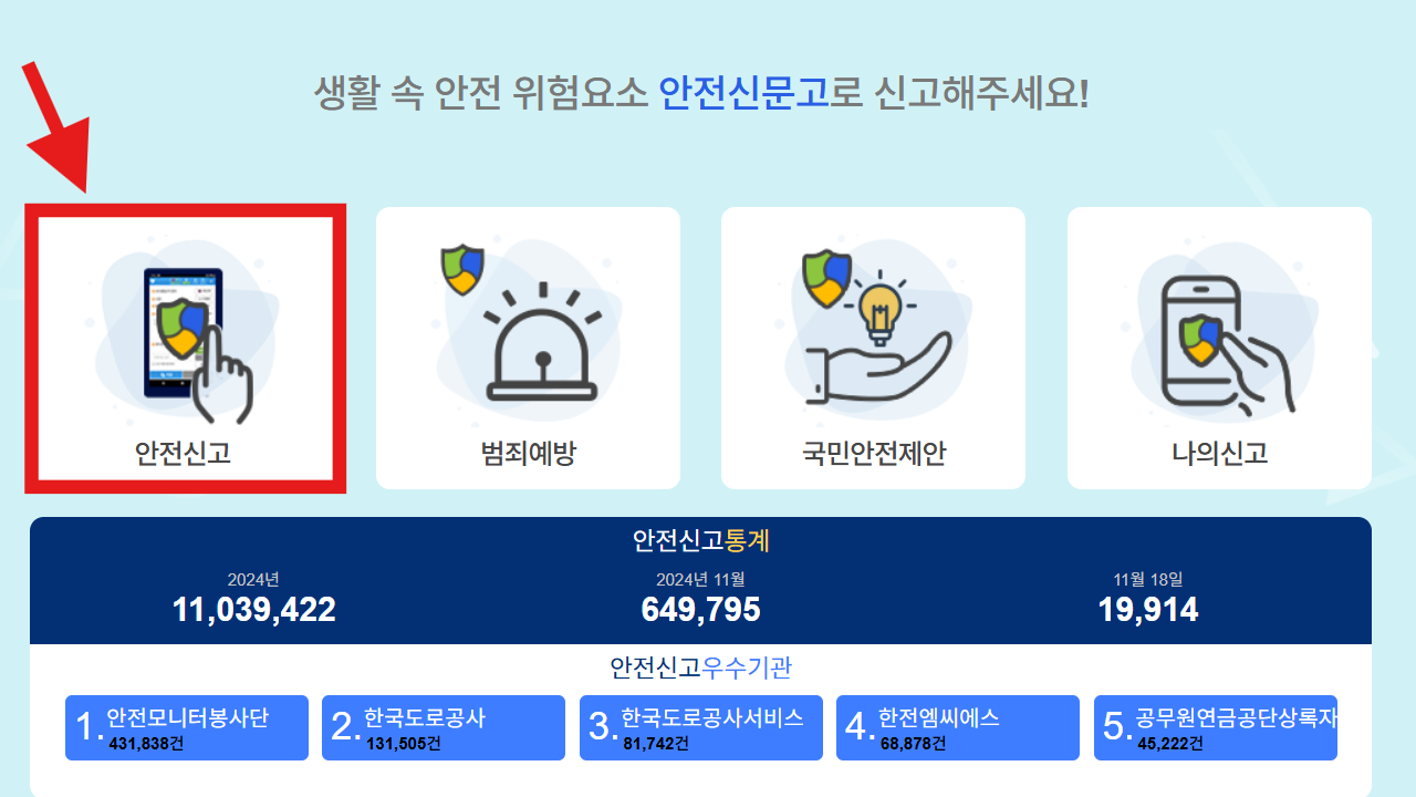 재난 또는 그 밖의 사고·위험으로부터 국민의 안전을 확보하기 위하여 안전위험 상황을 행정기관 등에 신고하는 행위입니다.