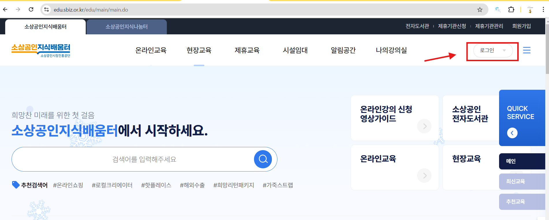 소상공인 지식배움터 아이디와 비밀번호로 로그인합니다.