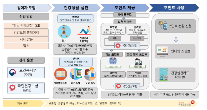 - 모바일 앱('The 건강보험')에서 내장된 걸음 수 측정기와 연동