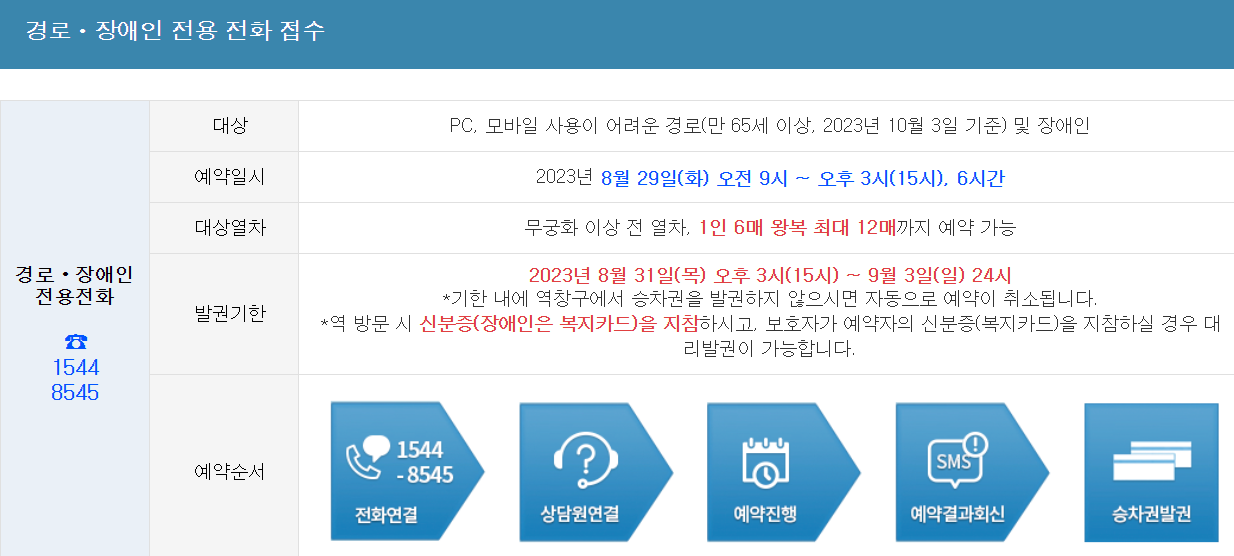 모바일 또는 PC가 어려운 만 65세 이상 및 장애인을 위해 8월 29일 오전 9시 ~ 오후 3시 6시간 동안 전용전화 1544-8545로 전화 예매가 가능합니다.
