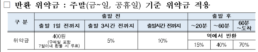 기차표 예매분에 대한 반환 위약금은 아래와 같이 적용됩니다.