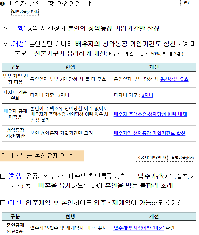 그 외에도 청약통장 가입 기간을 부부끼리 합산 가능하게 하고, 배우자의 결혼 전 주택소유나