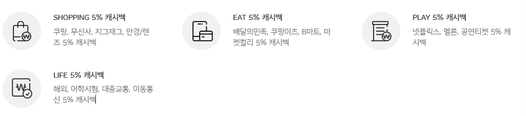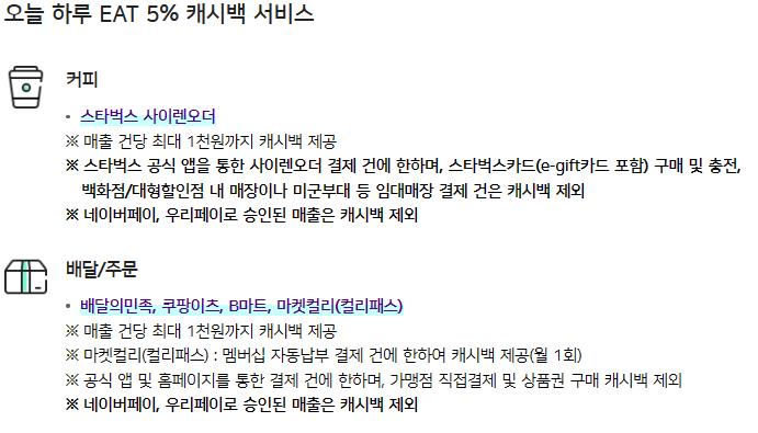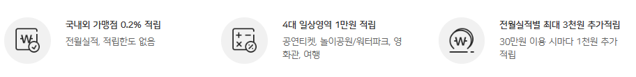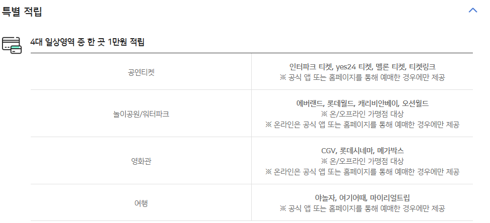| 영화관 | CGV,롯데시네마,메가박스 *온/오프라인 가맹점 대상 *온라인 공식 앱 또는 홈페이지를 총해 예매한 경우에만 제공 |